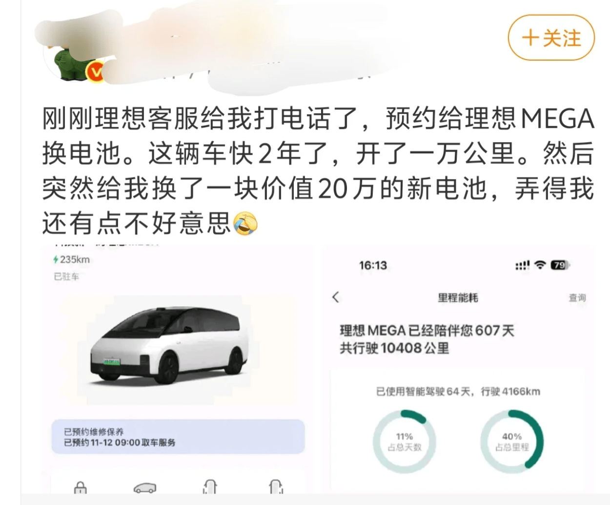 根据车主 “狗蛋儿聊车” 的分享,他的理想 MEGA 购车近 2 年,总里程仅 10408 公里,却被理想客服主动预约更换全新电池包。要知道,一块理想 MEGA 的电池成本约 20 万元,就算是付费更换,也得花掉车主小半年的油钱。这种 “主动送福利” 的操作,让车主直呼 “不好意思”,也让围观网友炸开了锅。